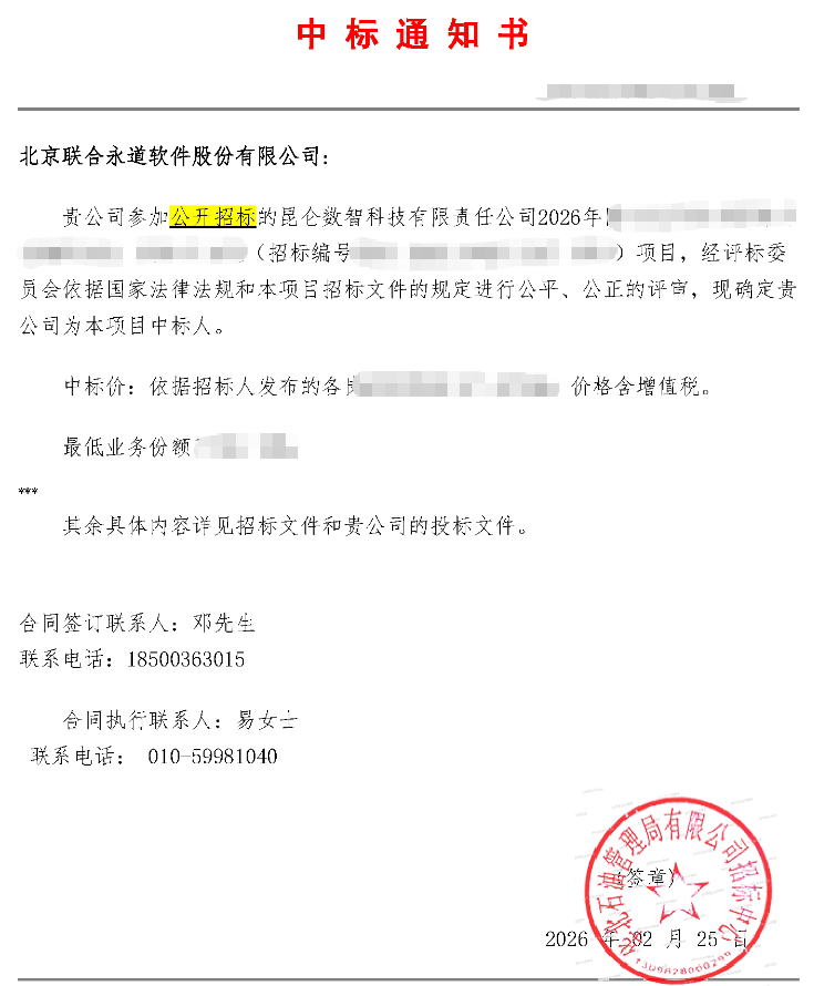 近日,北京联合永道软件股份有限公司(股票代码:430664)正式收到中标通知书,凭借专业技术实力、成熟项目经验与完善服务体系,成功中标昆仑数智科技有限责任公司 2026 年服务外包框架。此次中标,是联合永道在能源数字化领域的又一重要突破,标志着公司在大型央企技术服务市场的品牌影响力与综合竞争力再获权威认可。