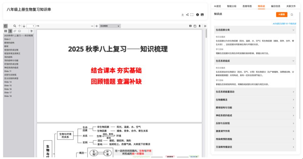 ●文献快速抓重点:上传科研论文或长篇教案,一键生成内容摘要、思维导图和核心知识点,不用逐字逐句读,几分钟就能get核心信息,备课、写报告效率翻倍;