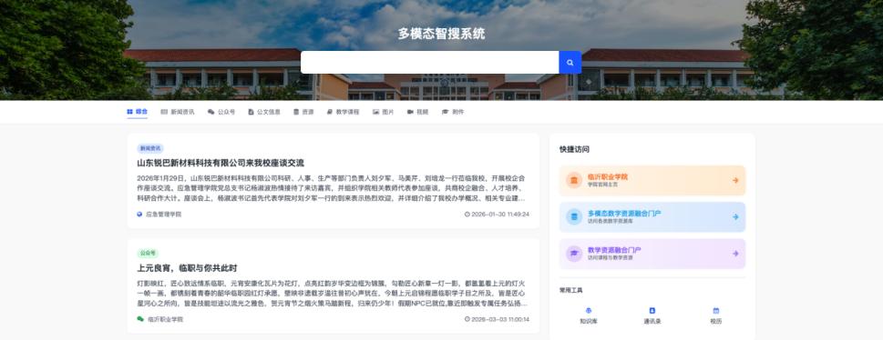●智搜门户:支持校内多套业务系统与第三方平台资源的统一汇聚融合,通过栏目分类有序展示、综合检索精准查询,并提供分类浏览,实现全域资源集中管理,支持用户一站式查阅校内资讯、公众号内容、公文信息、教学课程等各类相关内容。